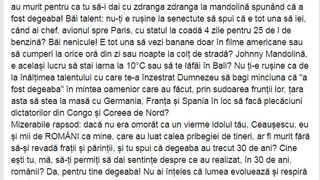 de ani? Cine ești tu, mă, să-ți permiți să dai sentințe despre ce au realizat, în 30 de ani, românii? Da, pentru tine degeaba! Nu ai înțeles că lumea evoluează și respiră fericire, nu plenare PCR! N-o mai lungesc că e degeaba cu tine, și îți spun atât: să-ți fie rușine, canalie talentată! Să-ți fie rușine nici măcar pentru că ți-ai bătut joc de eforturile a 20 de milioane de oameni! Ci pentru că, la bătrânețe, ți-ai bătut joc de ce-ai făcut o viață întreagă, ți-ai bătut joc de talentul unic pe care l-ai primit de la Natură, ți-ai bătut joc