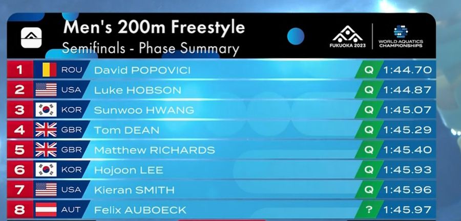 David Popovici s-a calificat de pe prima poziție în finala de 200 metri liber, cu un timp de 1:44:70, timp cu care Popovici i-a devansat pe toți adversarii săi din finala de marți.