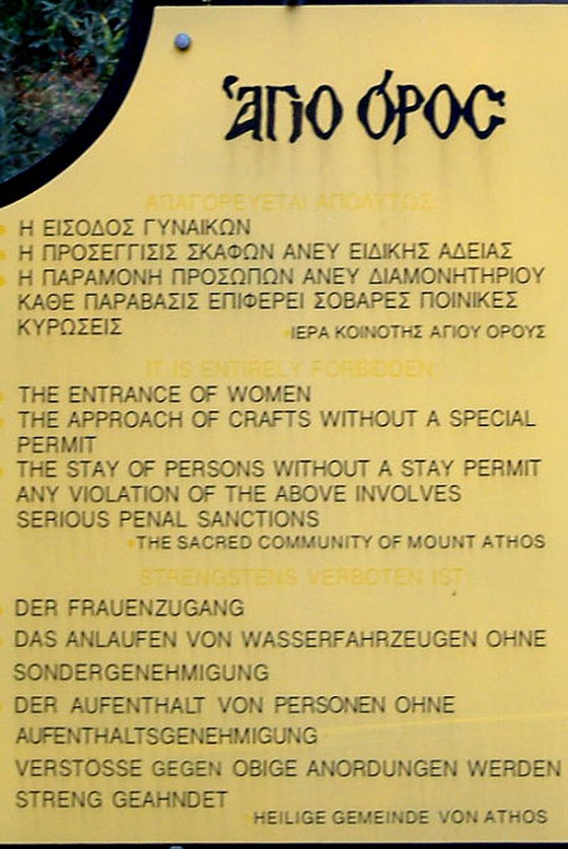 Dr. Graham Speake, autorul lucrarii "Mount Athos: Renewal in Paradise", spune ca legislatia locala precizeaza explicit ca animalele de sex feminin sunt excluse de pe teritoriul sfant, insa nu spune nimic despre femei, intrucat "toata lumea stie ca prezenta femeilor in manastirile pentru barbati este exclusa", conform hotnews.ro