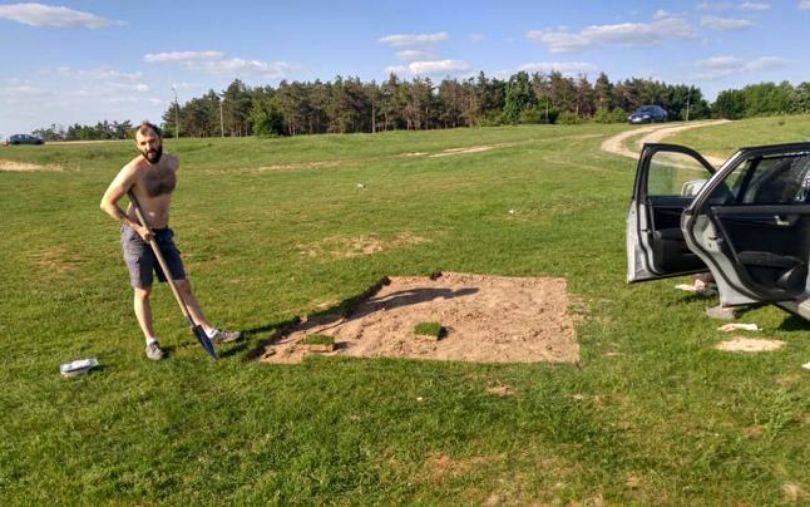 De ce sa cumperi cand poti lua gratis? A patruns cu masina de lux intr-o rezervatie naturala si a furat gazon cu lopata! Pagubele sunt uriase!