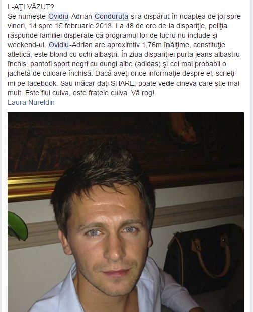 Familia l-a dat disparut imediat si au inceput cautarile. Pe paginile de socializare au fost distribuite anunturi cu poza lui Ovidiu.