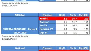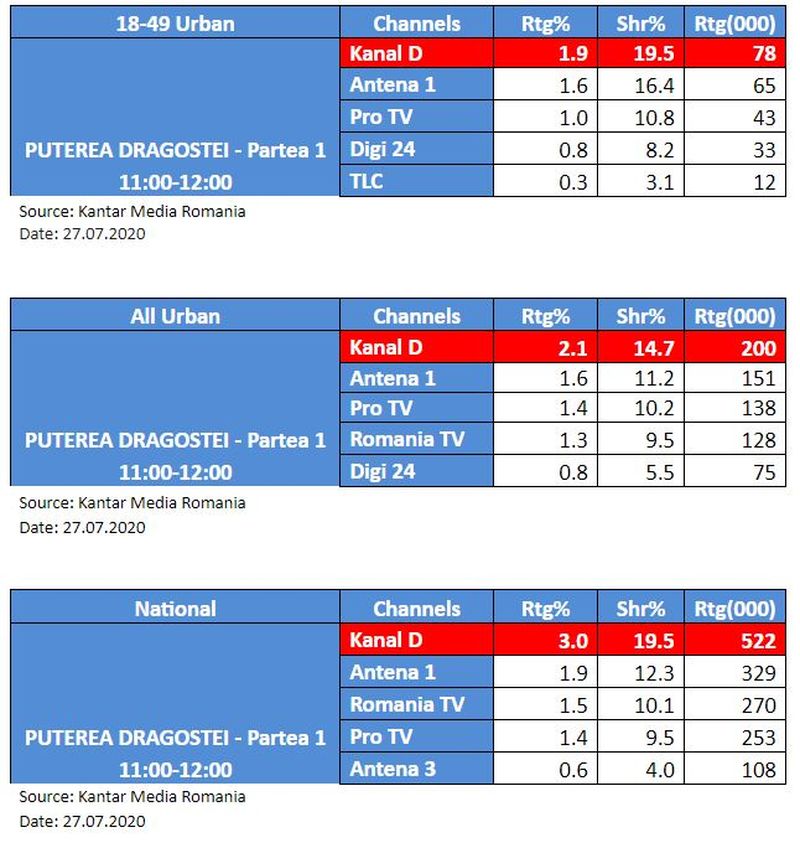 Luni, 27 iulie, debutul celui de-al treilea sezon al emisiunii “Puterea Dragostei”, prezentata de Cristina Mihaela Dorobantu a plasat Kanal D pe primul loc in topul televiziunilor din Romania, pe toate categoriile de public monitorizate.