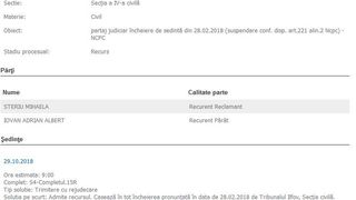 ” Acest conflict între fiul meu şi doamna Steriu s-a încheiat pentru că s-a făcut un act de partaj şi în virtutea acestui act de partaj, Albert a achiziţionat şi cealaltă jumătate. El a moştenit un sfert. Adrian avea doi copii. O jumătate îi revenea Irinei şi o jumătate lui Albert. Albert, de 4 ani şi jumătate a achiziţionat sfertul Irinei.