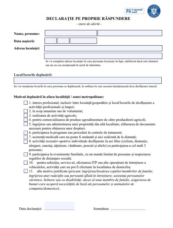 Declarația pe propria răspundere Ieşirea în afara localităţii se va face doar pentru motive întemeiate.