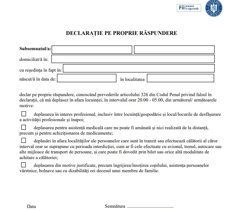 Astfel, între 20.00 și 05.00, restul populației care nu îndeplinesc condițiile trebuie să prezinte o declarație pe propria răspundere dacă au de efectuat deplasări în afara locuinței în acel interval.