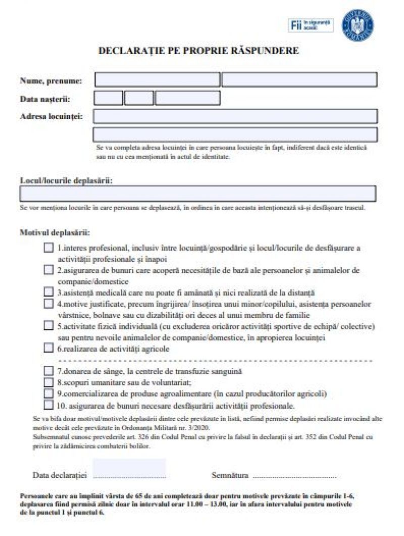 Declarație pe proprie răspundere. ”Astăzi am primit amenda de la Politia Aiud, d-nul agent Negru, pe motiv că nu am scris în declaraţie ora deplasării. Nu există în declaraţia pe proprie răspundere aşa ceva. Au mai trecut oameni pe stradă, nu au fost controlaţi, în amendă spunându-se că nu a fost nici un om pe drum. Asta pentru că am fost după alimente.