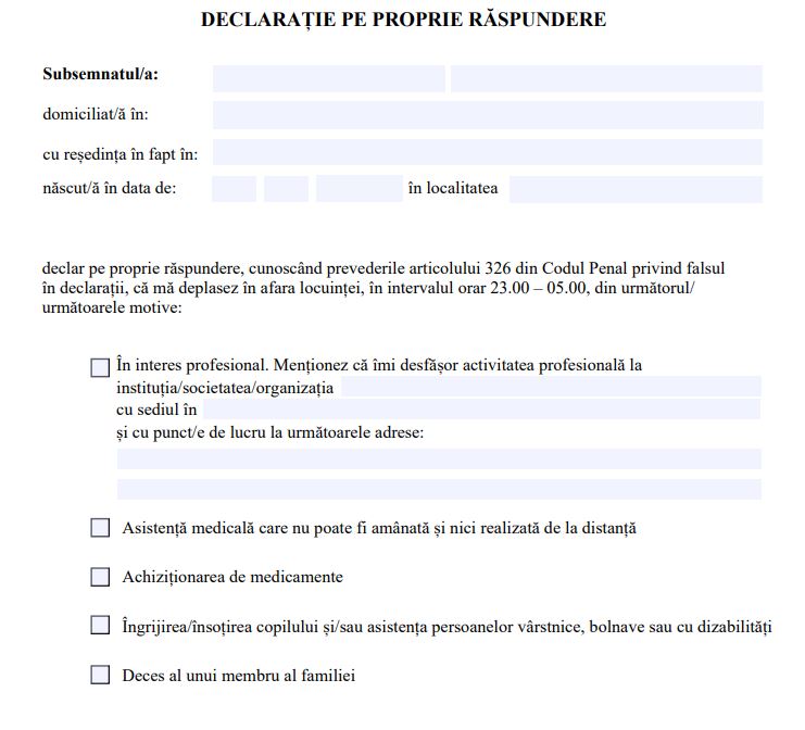 Declaraţia pe propria răspundere trebuie să cuprindă numele şi prenumele, data naşterii, adresa locuinţei/gospodăriei/locului activităţii profesionale, motivul deplasării, data completării şi semnătura.