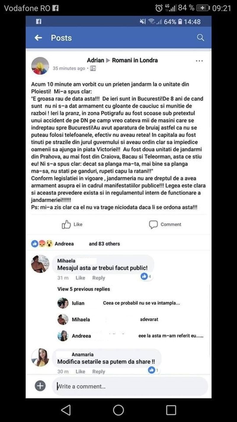 Actiunea Jandarmeriei de vineri ar fi fost bine pusa la punct, conform unei postari care s-a viralizat pe retelele de socializare. Un utilizator a povestit pe grupul de facebook "Romani in Londra" cum ca un prieten de-ai sai, de meserie jandarm, i-ar fi spus ca au primit ordin clar de a interveni in forta.