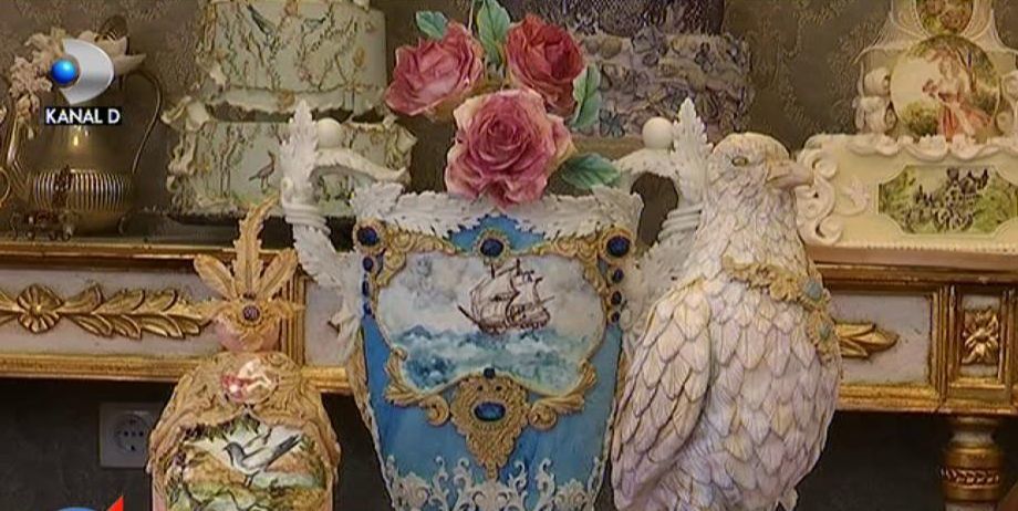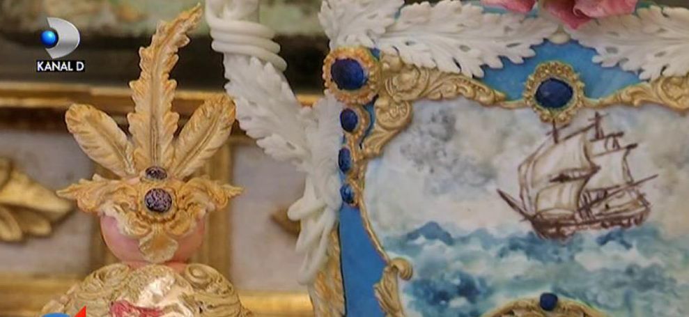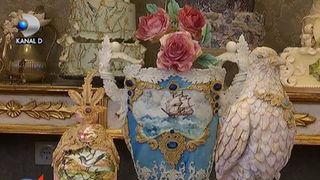 aici avem un pocal, o vaza...totul este comestibil. florile sunt facute din pasta de zahar, avem o pictura comestibila."Aceste decoratiuni inedite pot sa coste chiar si 2000 de euro.Totul depinde de complexitatea lor si de ingredientele folosite.Mai mult decat atat termenul de valabilitate este...