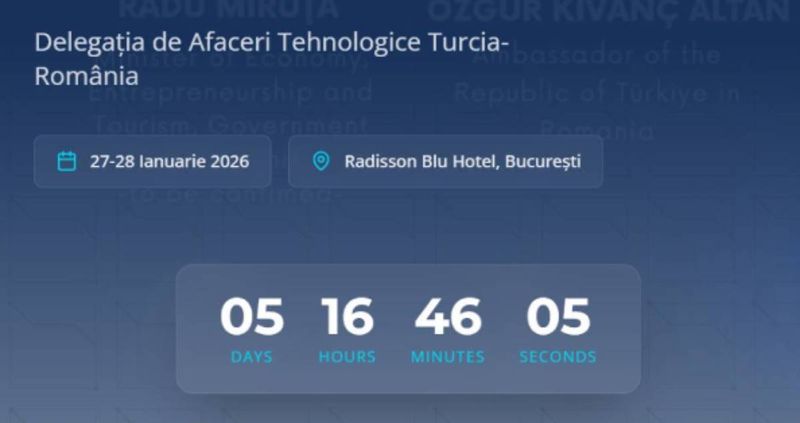 Organizată de Bilkent Cyberpark, delegația va avea loc în perioada 27–28 ianuarie 2026, la Hotelul Radisson Blu din București, reunind lideri din industrie, oficiali guvernamentali și inovatori din domeniul tehnologiei din ambele țări. Participanții vor explora sinergii în cinci sectoare-cheie: Transformare Digitală, Securitate Cibernetică, Tehnologii de Apărare, Orașe Inteligente și Inovație în Construcții.