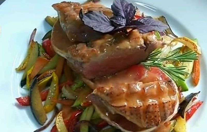 Pieptul de rata sa va lasa la gatit in sos cel putin 10 minute. Pentru garnitura de legume trebuie sa taiati julien ardeii,vinetele, ceapa, dovleceii si putina coaja de grapefruit.