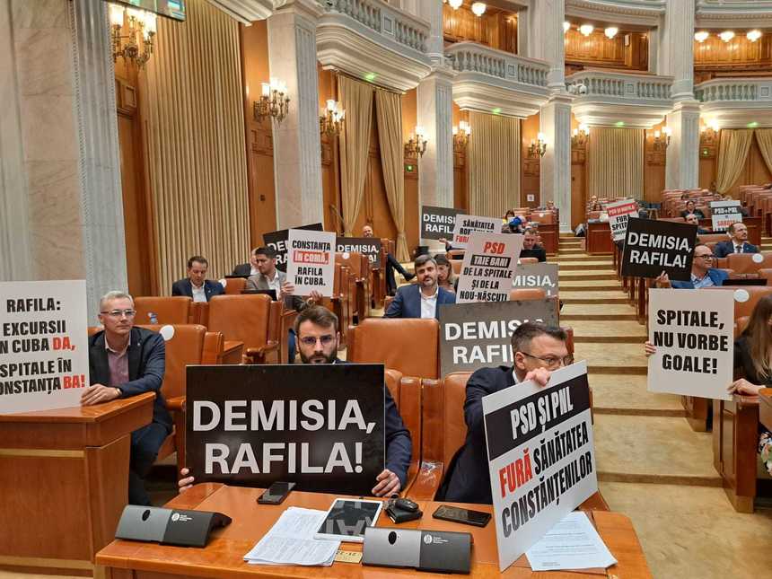 "Minciuni, calomnii repetate, dezinformare sunt ingredientele textului moţiunii depuse împotriva mea", a declarat Rafila după ce mai mulți deputați au afișat pancarte prin care i se cerea demisia.