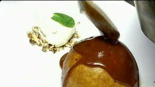 Dupa ce scoatem marul din cuptor, il asezam pe farfurie, il ornam cu sosul de caramel si evident, il servim cu inghetata. Un desert aburind merge intotdeauna cu ceva racoritor.