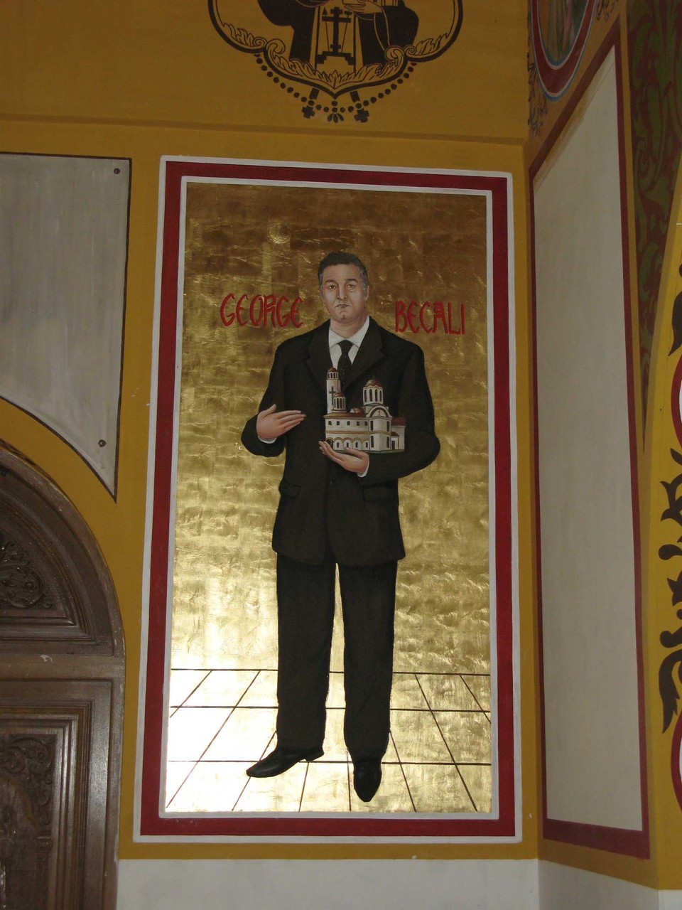 Pus la loc de cinste pe peretii manastirii, portretul lui Gigi ocupa jumatate din peretele principal, de deasupra intrarii, cealalta jumatate fiind acoperita cu portretul lui Petrache Lupu! Numai ca, surpriza, anii au trecut, Gigi Becali nu a mai dat bani ca pe vremuri pentru asezamant, iar "sanctiunea" a venit in plic pentru latifundiar, care acum a fost "retrogradat" pe un perete lateral, cu doar un bust pictat, pierdut printre trei fete bisericesti mult mai impunatoare!