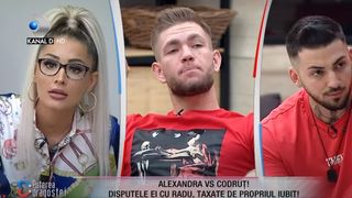 Conflictul verbal dintre Radu și Alexandra a continuat minute în șir. Alexandra i-a reproșat că s-a băgat în relația ei cu Codruț: "Eu am ceva cu tine, da, pentru că te bagi acolo unde nu te privește. Să-ți vezi de treaba ta și o să vezi că nu am nimic cu tine".