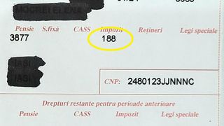 Un pensionar care are 1.90756 puncte de pensie (exemplul din talonul de mai jos) primește în prezent o pensie de 3.405 lei, din care i se reține impozit 141 de lei, deci pensia încasată în mână este de 3.264 lei.