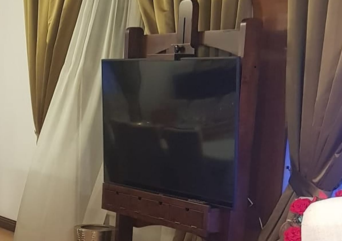 În imaginea care a făcut înconjurul presei se poate vedea o plasmă cu o diagonală mare așezat pe un obiect de mobilier care este realizat după modelul unui șevalet. Doar că în locul planșei este așezat televizorul. Obiectul de mobilier este realizat din lemn masiv și este lăcuit cu o culoare închisă, care să se asorteze cu grinda de lemn care separă zona de living față de cea de dining.