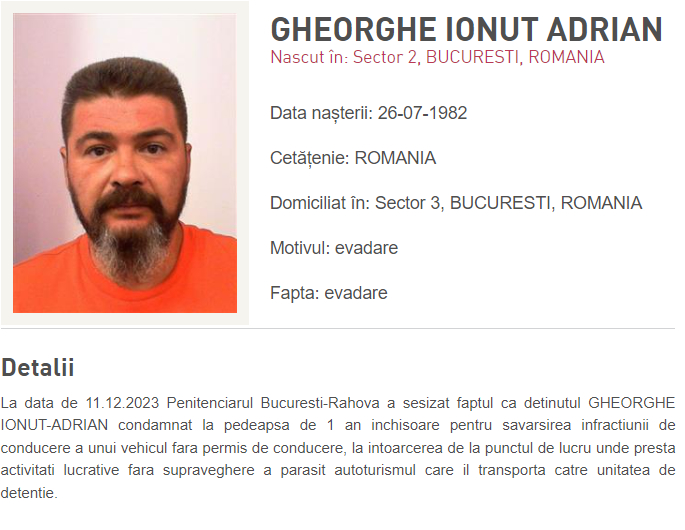 Luni, deţinutul Gheorghe Ionuț Adrian, condamnat definitiv la o pedeapsă privativă de libertate de 1 an de închisoare pentru săvârșirea infracțiunii de conducerea unui vehicul fără permis de conducere, a fugit dintr-o mașină care îl transporta către Penitenciarul Rahova, de la un punct de lucru. Acesta a fost dat în urmărire națională și consemn la frontieră.