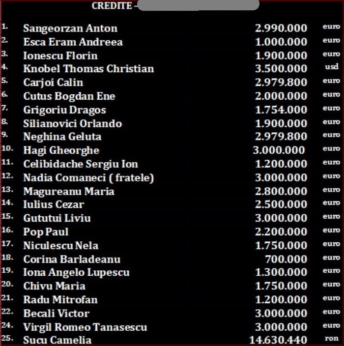 Publicația ”Lumea Justiției” a dezvăluit recent o listă cu celebrități autohtone care au primit credite uriașe de la o cunoscută bancă. Printre numele publicate pe lista luju.ro se regăsesc vedete precum Andreea Esca, Gheorghe Hagi, Ilie Năstase, Nadia Comăneci (prin fratele ei), Ioan Lupescu, Victor Becali sau Camelia Șucu, care au încheiat fiecare un contract de credit cu valori cuprinse între 1 și 3 milioane de euro.