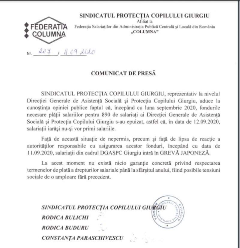 890 de salariați nu și-au primit salariile. Oamenii anunță că vor face din nou greva japoneză. Conform Sindicatului pentru Protecția Copilului Giurgiu, începând cu luna septembrie 2020, fondurile necesare plății salariilor pentru 890 de salariați ai Direcției Generale de Asistență Socială și Protecția Copilului Giurgiu s-au epuizat, astfel că giurgiuvenii nu și-au primit salariile pe data de 12 septembrie.