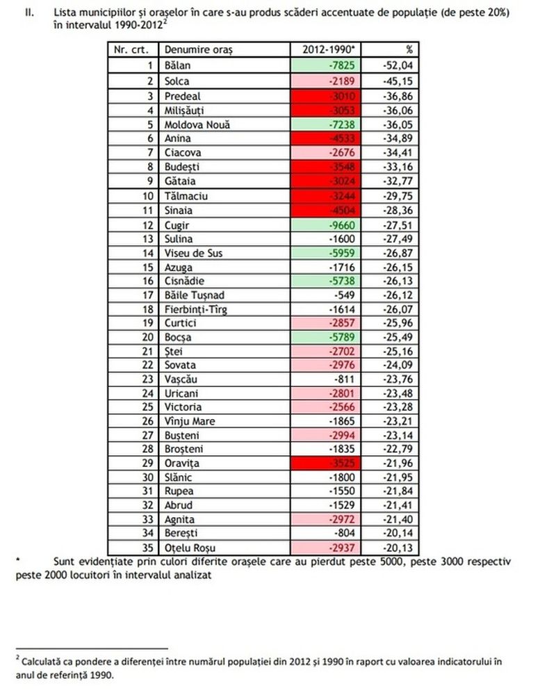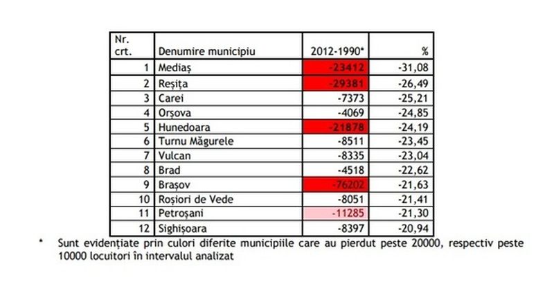 Printre oraşele al căror număr de locuitori a scăzut cu peste 20% se află Predeal, Sinaia, Buşteni, Slănic, Moldova Nouă, Sulina, Azuga, Băile Tuşnad, Sovata, iar pe lista municipiilor se înscriu, printre altele, Mediaş, Reşiţa, Hunedoara, Braşov, Petroşani, Sighişoara.