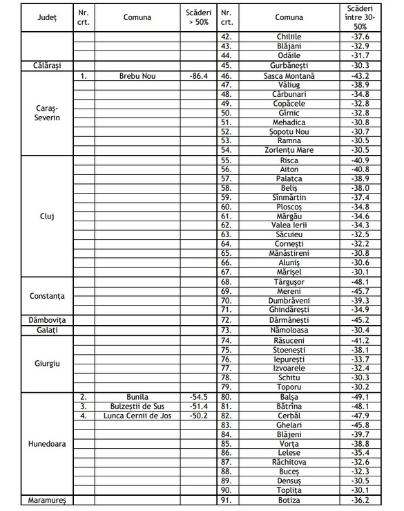 La nivel de comune, scăderi accentuate de populaţie, de peste 30%, au fost sesizate în 30 de judeţe: Alba, Arad, Argeş, Bihor, Bistriţa-Năsăud, Botoşani, Braşov, Buzău, Călăraşi, Caraş-Severin, Cluj, Constanţa, Dâmboviţa, Galaţi, Giurgiu, Hunedoara, Maramureş, Mehedinţi, Olt, Prahova, Sălaj, Satu Mare, Sibiu,
