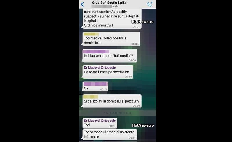 Site-ul a postat mesaje pe care le-au primit cadrele medicale de la Macovei. „Bună seara! La ora 7:30 toate cadrele medicale care sunt confirmati pozitiv, suspecti sau negativi sunt asteptati la spital! Ordin de ministru!”- se arată într-un mesaj pe WhatsApp trimis către toți șefii de secție de la Spitalul Județean Suceava de către directorul medical dr. Alexandru Macovei. Mai departe, în conversație, șefii de secție întreabă să fie siguri că au înțeles bine ce li se cere: „Și cei izolați la domiciliu și cei pozitivi??”.