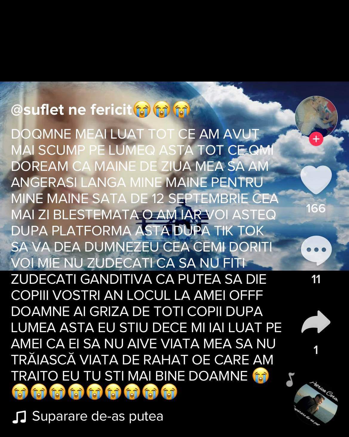 „Doamne, mi-ai luat tot ce am avut mai scump pe lumea asta. Tot ce îmi doream, ca mâine, de ziua mea, să am îngerașii lângă mine. Mâine, pentru mine, data de 12 septembrie, e cea mai blestemată zi, iar voi, cei după platforma asta, de pe TikTok, să vă dea Dumnezeu ce îmi doriți voi mie. Nu judecați, ca să nu fiți judecați. Gândiți-vă că puteau să fie copiii voștri în locul alor mei”, a scris mama gemenilor din Ploiești pe TikTok.