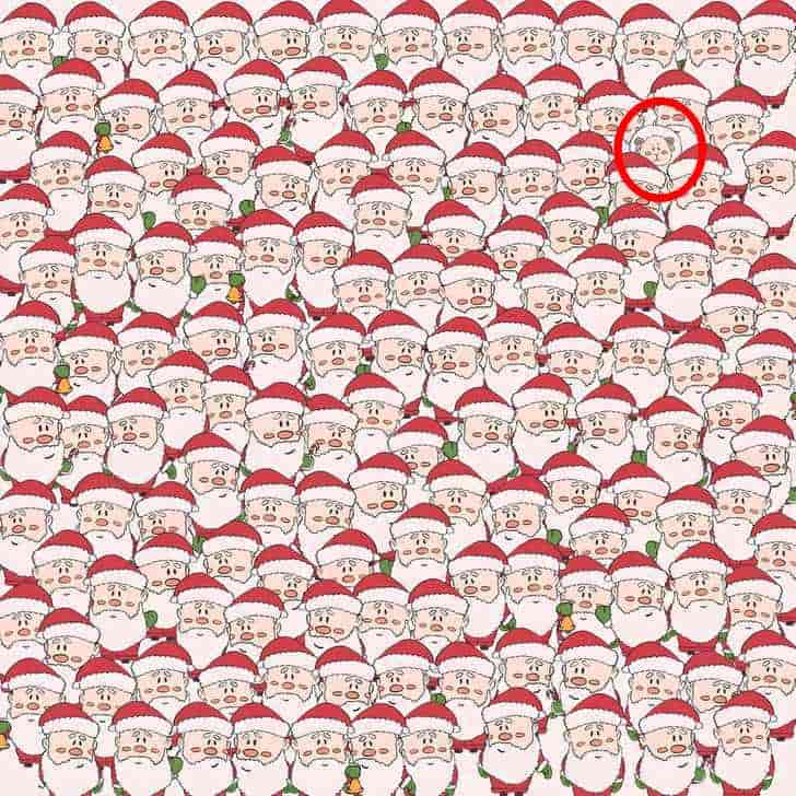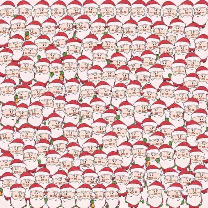 Poți încerca testul de mai jos. În acest puzzle cu tematică de Crăciun, poate fi văzut un grup de Moș Crăciuni.