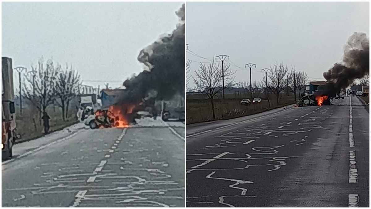 În urma impactului, autoturismul condus de bărbatul de 28 de ani a fost cuprins de flăcări.