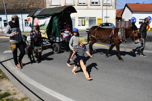 O familie cu 4 copii a plecat din Franţa, într-o călătorie prin lume, cu o căruţă trasă de un măgar.