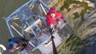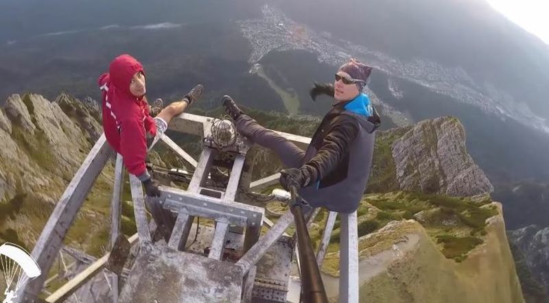 Fara centuri de siguranta, dar cu un selfie stick, teribilistii se filmeaza in timp ce se plimba pe varful crucii.