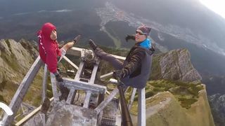 "Tot ce fac e scandalos", scrie la descrierea clipului. In imagini, cei doi tineri fac echilibristica si flotari pe crucea care se afla la 2291 m altitudine.