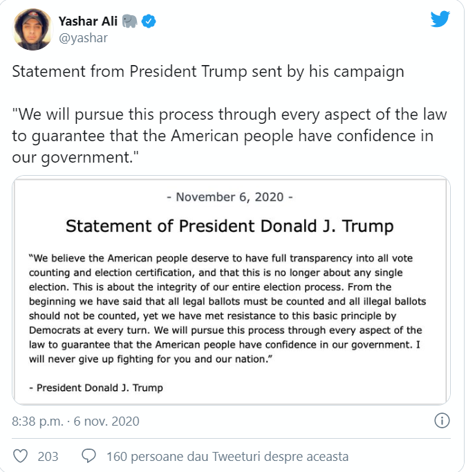 "Credem că poporul america merită o transparenţă totală la numărarea voturilor şi certificarea alegerilor, şi nu este vorba doar de alegeri. Este vorba de integritatea întregului nostru sistem electoral. De la început am spus că buletele legale trebuie numărate şi cele ilegale nu trebuie numărate, dar de fiecare dată ne-am confruntat cu rezistenţa democraţilor în faţa acestui principiu. Vom cotinua acest proces prin toate aspectele legale pentru a garanta că poporul american are încredere în Guvernul nostru.