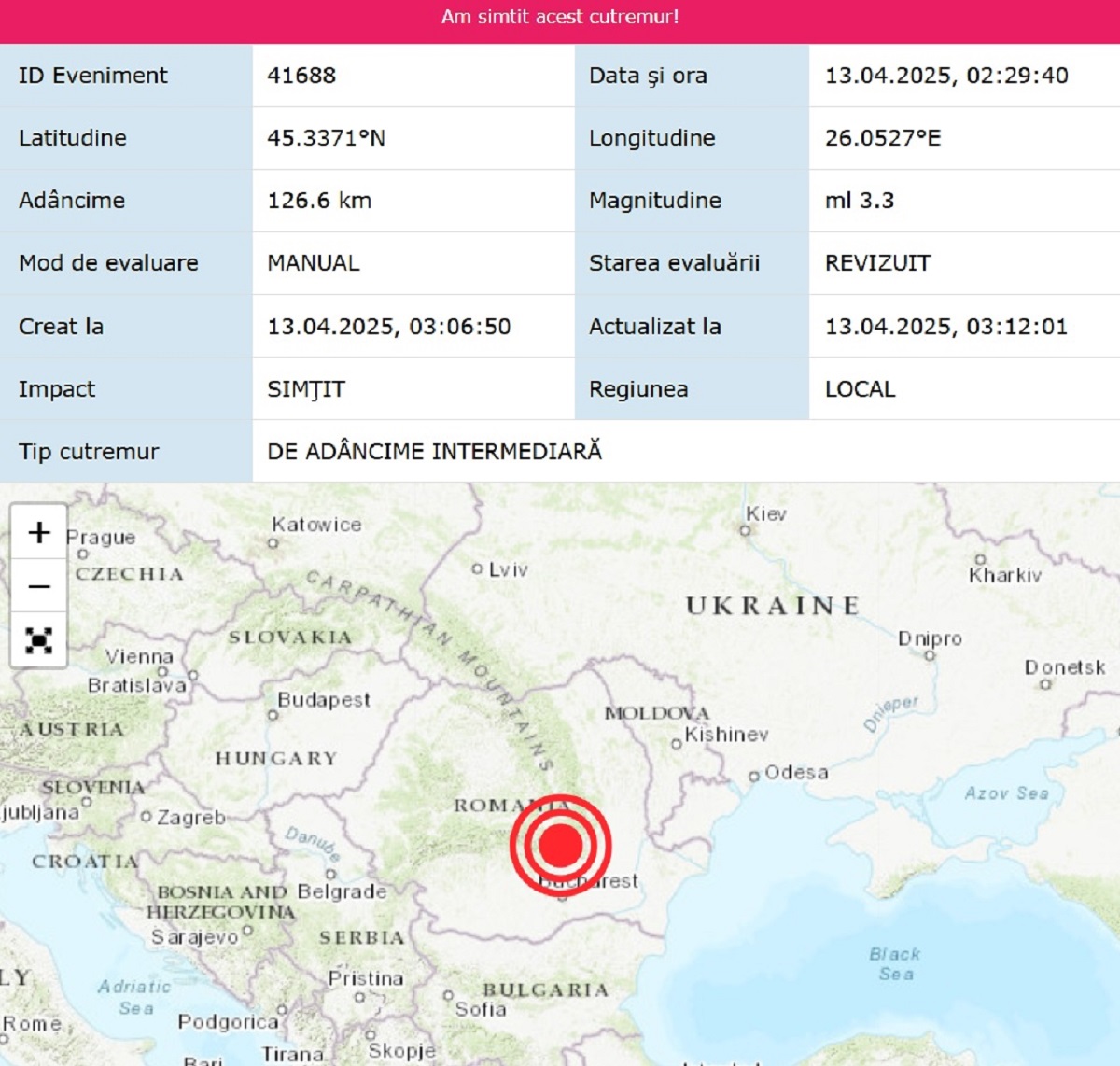 Cel mai recent cutremur înaintea celor de azi a fost în Banat, sâmbătă 12 aprilie și a avut o magnitudine de 3,2 grade.