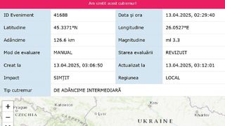 Al doilea seism, după ora 7 dimineața. În ziua de 13 Aprilie 2025, la ora 07:21:22 (ora locală a României), s-a produs în ZONA SEISMICA VRANCEA, VRANCEA un cutremur slab cu magnitudinea ml 2.2,