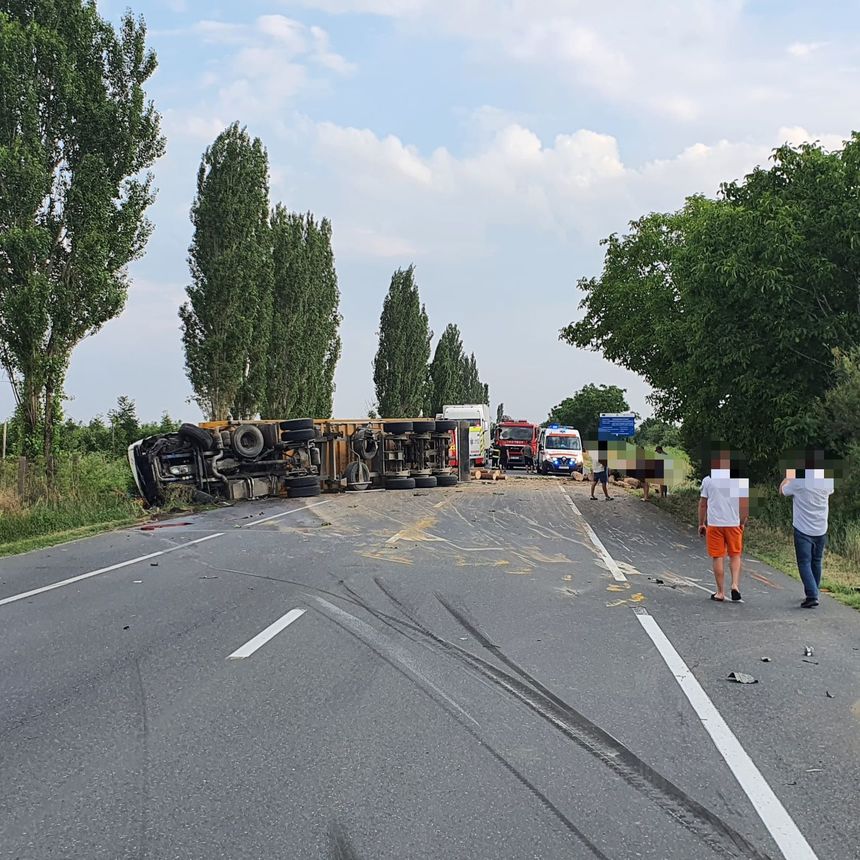 ”Unui autocamion încărcat cu lemne i-a explodat pneul, a acroşat un autoturism şi, ulterior, s-a răsturnat pe carosabil”, a transmis Centrul Infotrafic.