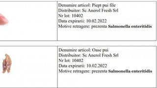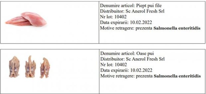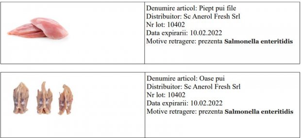 ”SC Anerol Fresh Srl Oradea a început retragerea de la vânzare și de la client a unui lot de piept pui file, care expira pe 10 februarie, și a unui lot de oase de pui, cu aceeași dată a expirării, din cauza prezenței de salmonella enteritidis.