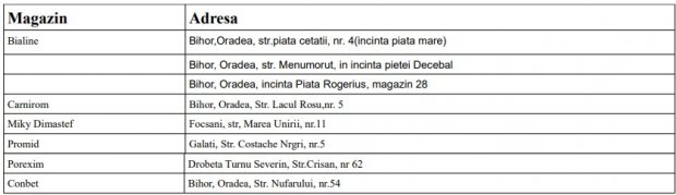și 10.02.2022, vă rugăm să nu îl consumați și să îl returnați în magazinele menționate în tabelul de mai jos împreună cu bonul fiscal care face dovada achiziției, urmând să primiți contravaloarea acestuia.