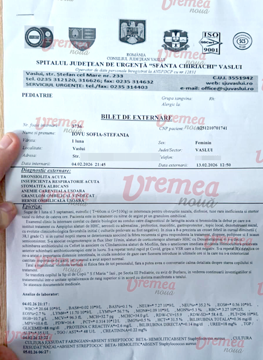 Iar la momentul externării, pe foaia de externare, medicii din spitalul din Vaslui au scris următoarele: bronșiolită acută, insuficiență respiratorie acută, stomatită albicans, anemie carențială ușoară, granulom ombilical videcat și hernie ambilicală ușoară. Printre toate aceste diagnostice, nu se găsește, însă, și cel de bronchopneumonia, boală care i-a afectat trei sferturi din plămânul drept copilei.