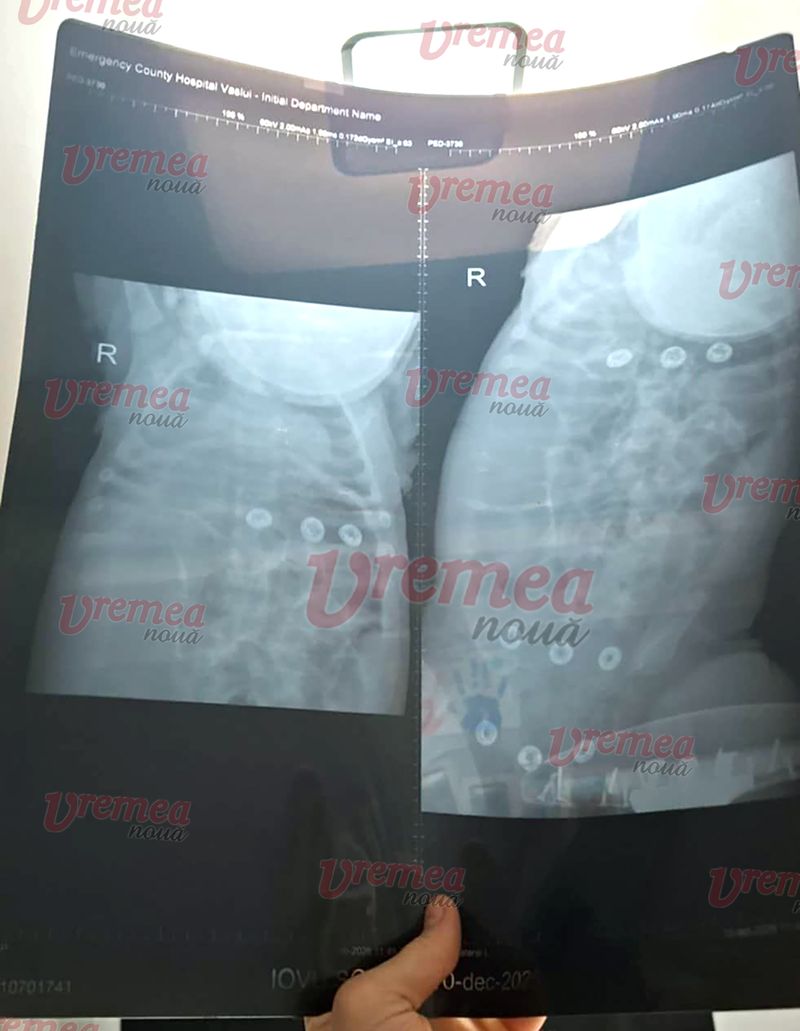 Ce se vede însă clar pe radiografie sunt nasturii de la hainele copilei, nicidecum plămânii afectați ai micuței.