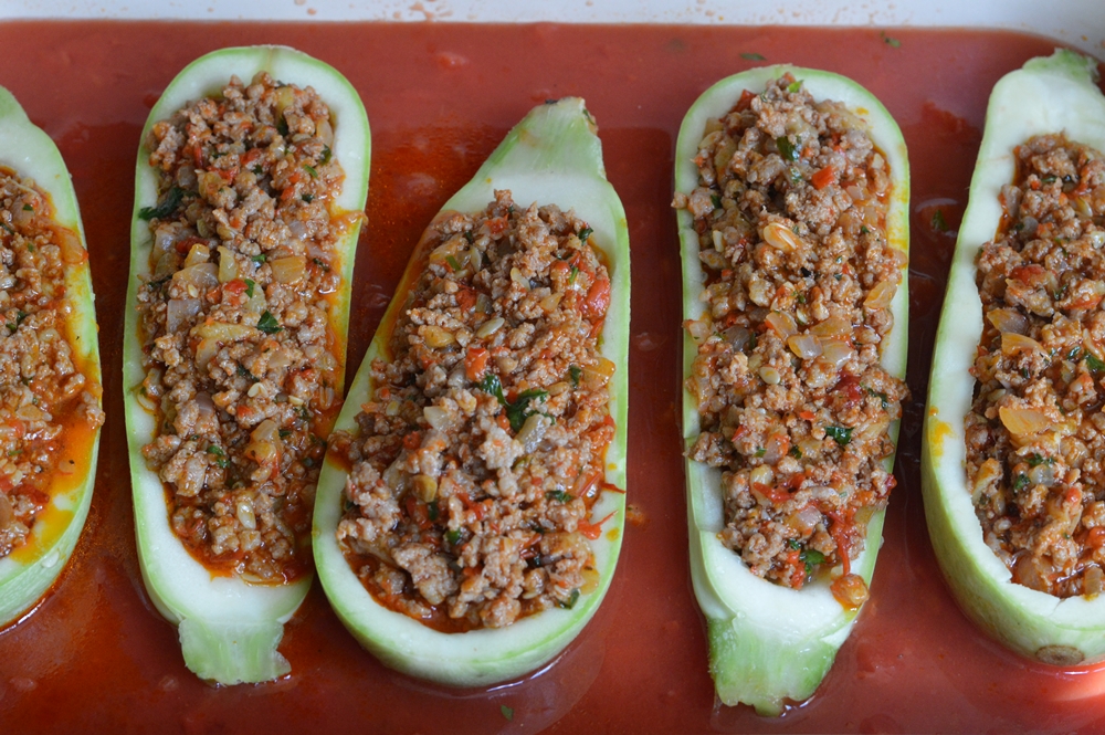 Dovlecei umpluți cu carne tocată și sos de roșii la cuptor
