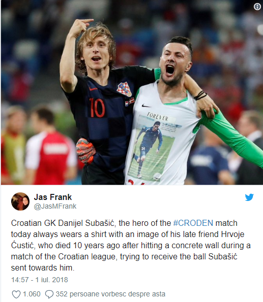 Portarul care a aparat trei lovituri de la 11 metri si a dus echipa croata in sferturile competitiei a ridicat mainile in sus si a exclamat. “Nu sunt un erou, asa cum ma vede tara mea! Ii dedic victoria ingerului meu pazitor. Hrvoje a murit la 24 de ani, dar va fi intotdeauna cu mine, nu numai pe tricou, ci si in mintea mea”, a spus Subasic cu referire la fostul sau coleg si prietenul, decedat in urma cu cativa ani.
