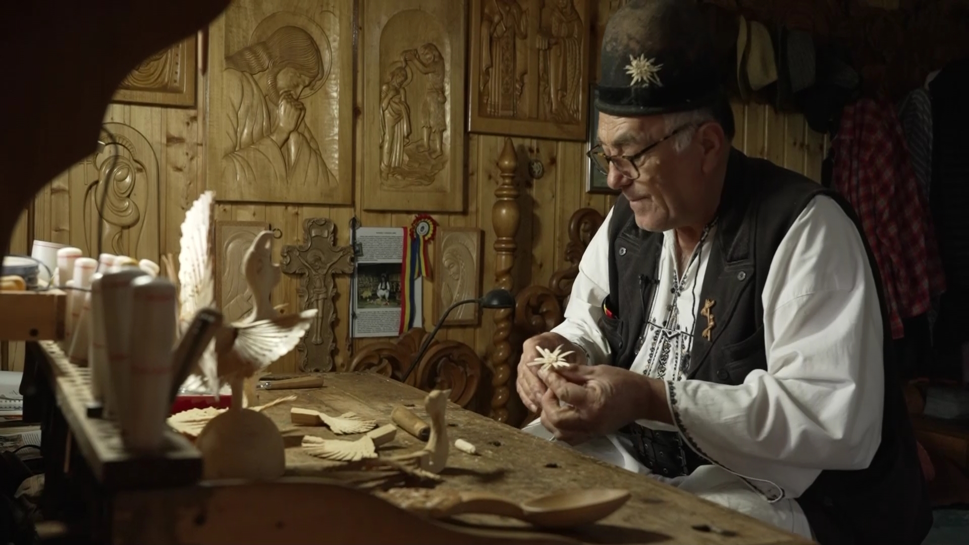 Cât e ziua de lungă Ion Rodoș meșterește în atelierul lui, unde da viață lemnului zămislind obiecte tradiționale. Cocoșul de munte, simbolul locului, lingurile, figurinele de legendă, personajele istorice, troițele, crucile, fiecare are povestea ei și aceeași energie – a meșterului cu figura de poveste.