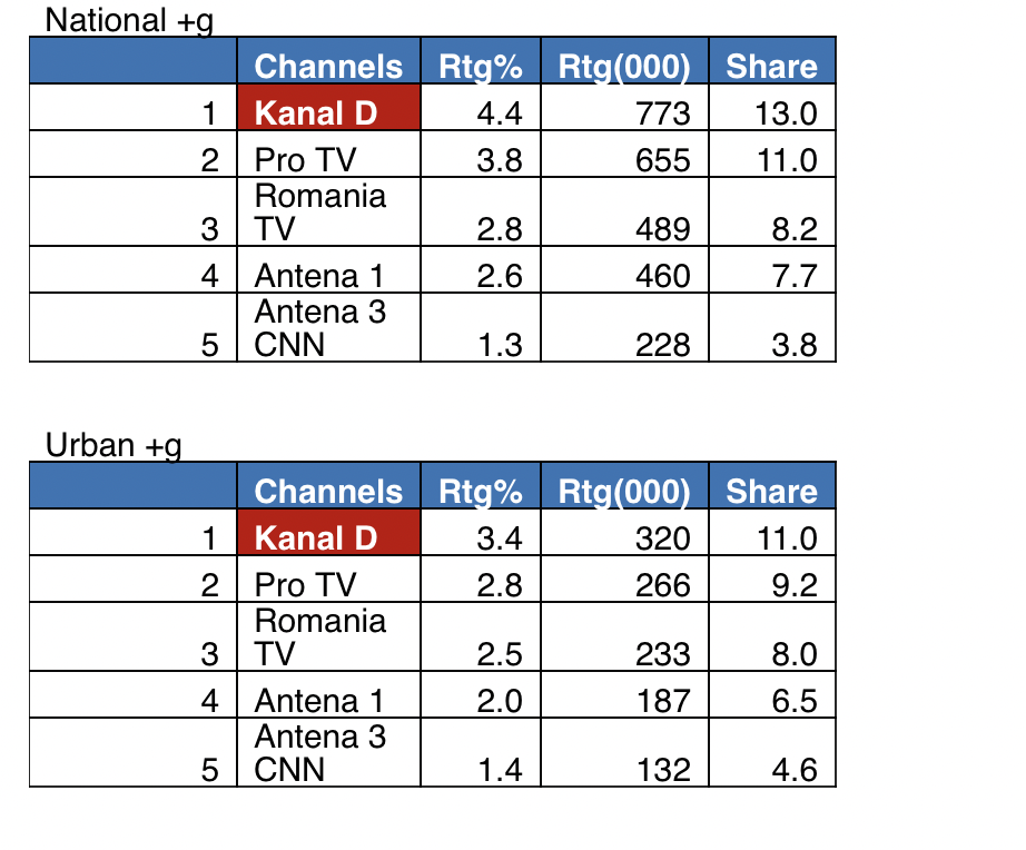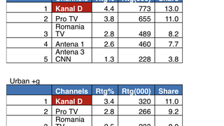 Ieri, în intervalul orar 16:00 – 18:00, Kanal D a înregistrat 4.4 puncte de rating și 13% cota de piață, pe targetul Național, și 3.4 puncte de rating și 11% cota de piață, pe targetul All Urban.