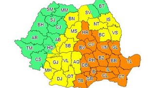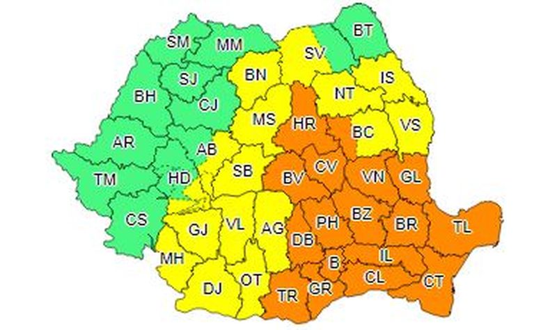Totodată, este cod portocaliu în judeţele Dâmboviţa, Teleorman, Giurgiu, Prahova, Buzău, Brăila, Ialomiţa, Călăraşi, Ilfov, Vrancea, Galaţi, Braşov, Covasna, Harghita, Constanţa, Tulcea, precum şi municipiul Bucureşti şi în zona de munte a judeţelor Mureş şi Bacău.
