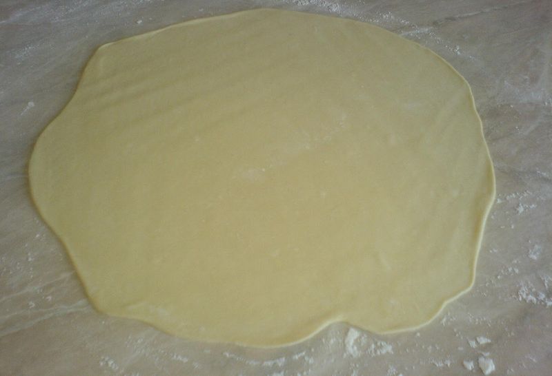 2. Se împarte aluatul în doua sau trei parti, se înfaineaza masa de lucru si se munceste fiecare parte cu sucitorul pana obtinem o mare clatita, cat mai subtire.