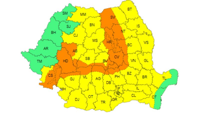"În sud-vestul Transilvaniei și pe arii extinse la munte vor fi perioade cu averse torențiale. În intervale scurte de timp sau prin acumulare cantitățile de apă vor fi de 30...40 l/mp și pe arii restrânse de peste 50...70 l/mp", se arată în informarea Administrației Naționale de Meteorologie.