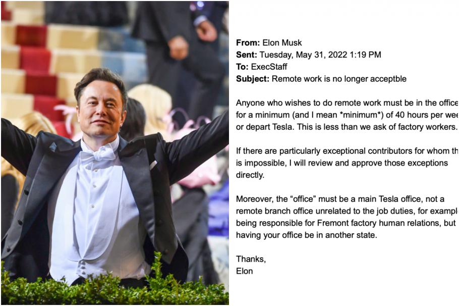 Elon Musk le-a cerut angajaţilor de la Tesla să se întoarcă la birou sau să plece definitiv din companie, conform unui e-mail trimis chiar de el, capturi cu mesajul fiind publicate în mediul online. Două surse au confirmat autenticitatea e-mailul pentru Reuters. ”Toată lumea de la Tesla trebuie să petreacă cel puţin 40 de ore la birou pe săptămână. Dacă nu vii, vom presupune că ai demisionat”, mai precizează Musk în e-mail.