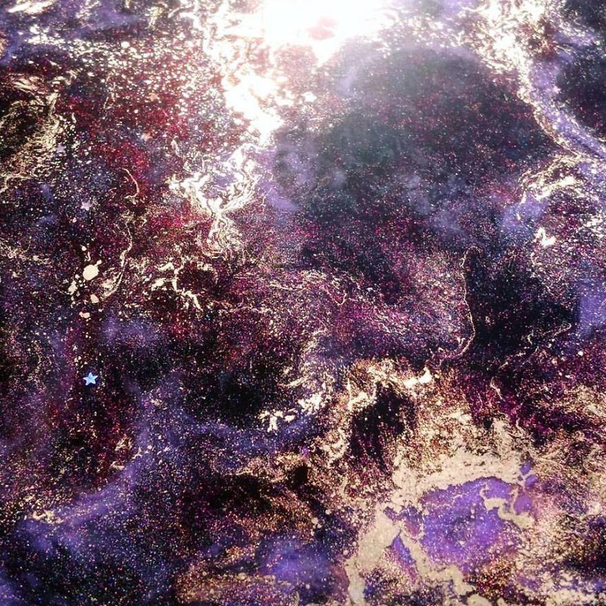 Fetita picteaza galaxii folosindu-se de tot felul de instrumente ciudate. Pentru precizie foloseste furculita de lemn sau de o frigaruie.